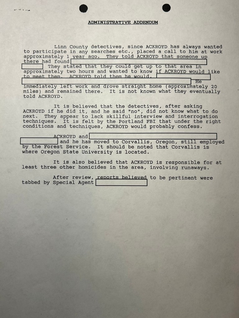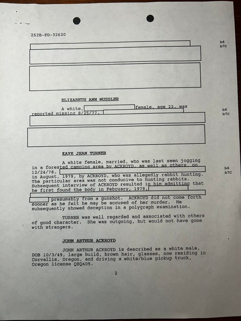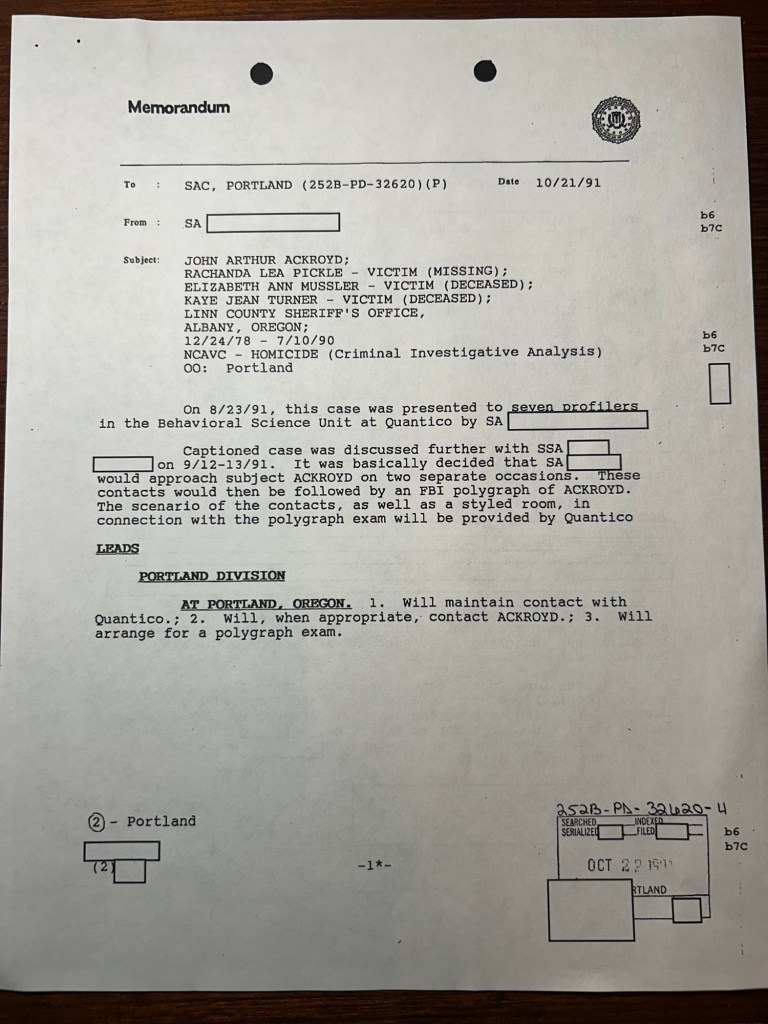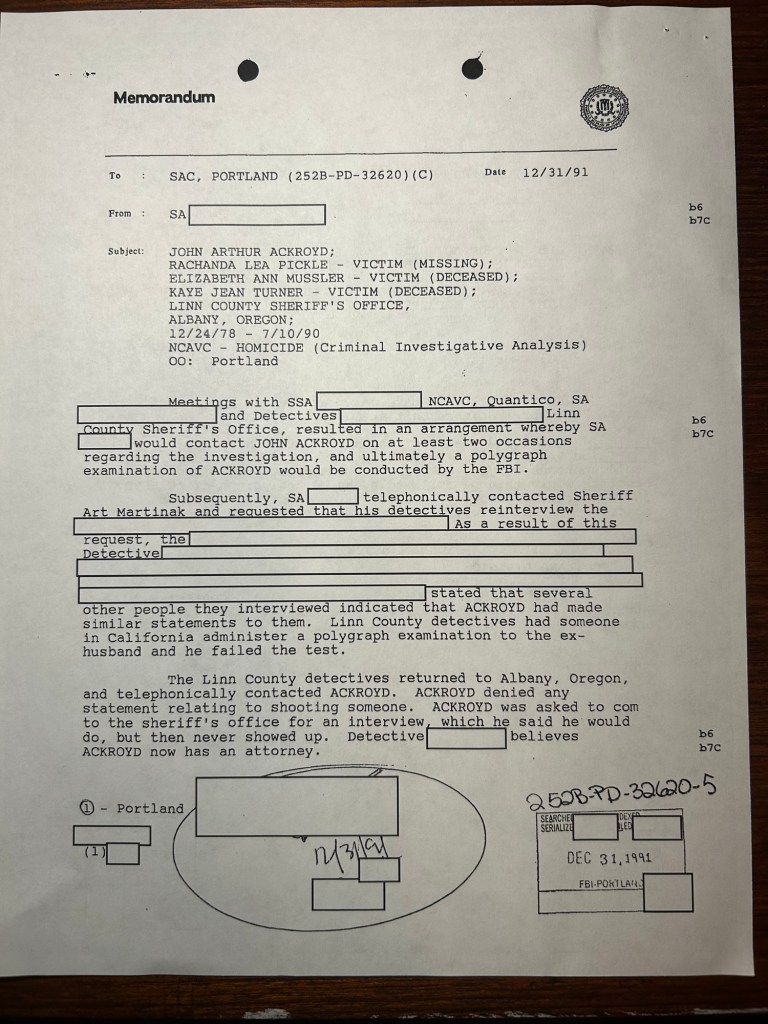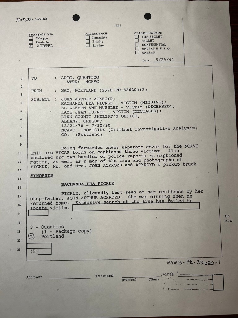 4/11/1986- OSP submits Kaye Jean Turner’s case to the Violent Criminal Apprehension Program (VICAP) run by the FBI’s Behavioral Analysis Unit. This is an airtel to the Portland FBI Field Office informing them that a VICAP report has been filed within their region.Further information in the 4/11/1986 airtel from Behavioral Analysis to Portland2/6/2012- A document from the reinvigoration era of the Ackroyd associated investigations as Ackroyd approached parole eligibility for his murder of Kaye Turner. This page documents a change in assignment for the FBI crime analyst assigned to Rachanda Pickle’s case.Airtel from SAC Portland to Behavioral Analysis regarding the Rachanda Pickle investigation, including information regarding Kaye Jean Turner and Elizabeth Ann Mussler. Dated 5/29/1991, this is approximately 11 months after Rachanda vanished from Santiam Junction. This is also the earliest document that associates Elizabeth Mussler’s 1977 homicide with John Ackroyd.Page 2 of the 5/29/1991 airtelPage 3 of the 5/29/1991 airtelAddendum to the 5/29/1991 airtel. Interesting to note that this document was produced after ODOT transferred Ackroyd from Santiam Junction to the Corvallis shops. Also of note is the 4th paragraph, which links Ackroyd to “three other homicides in the area, involving runaways.” Karen and Rodney are two of that number. Elizabeth Mussler, since she was an adult reported missing could be the third, as could the Swamp Mountain or Snow Creek Does. It is interesting to me that Ackroyd was linked to these late 70’s cases as early as 1991. Acknowledgement from the VICAP program to Linn County Sheriff’s Office that Elizabeth Ann Mussler’s case has been submitted to the VICAP system.Page 2 of the VICAP acknowledgement to LCSO re: MusslerCourtesy copy of the Mussler VICAP acknowledgement to the Portland FBI Office10/21/1991 A memo regarding VICAP profiling of the Rachanda Pickle, Kaye Jean Turner and Elizabeth Mussler cases. An interrogation approach has been developed to elicit a confession from Ackroyd.12/31/1991- Report from the Special Agent assigned to Ackroyd’s interrogation to the SAC in Portland. The conclusion of the Special Agent’s 12/31/1991 report, indicating that the interrogation approach was no longer feasible and that the FBI’s should close their part of the investigation.Oregonian Article, 6/14/1992 about the arrest of John Arthur Ackroyd and Roger Dale Beck in the murder of Kaye Jean Turner. Included in the FBI file