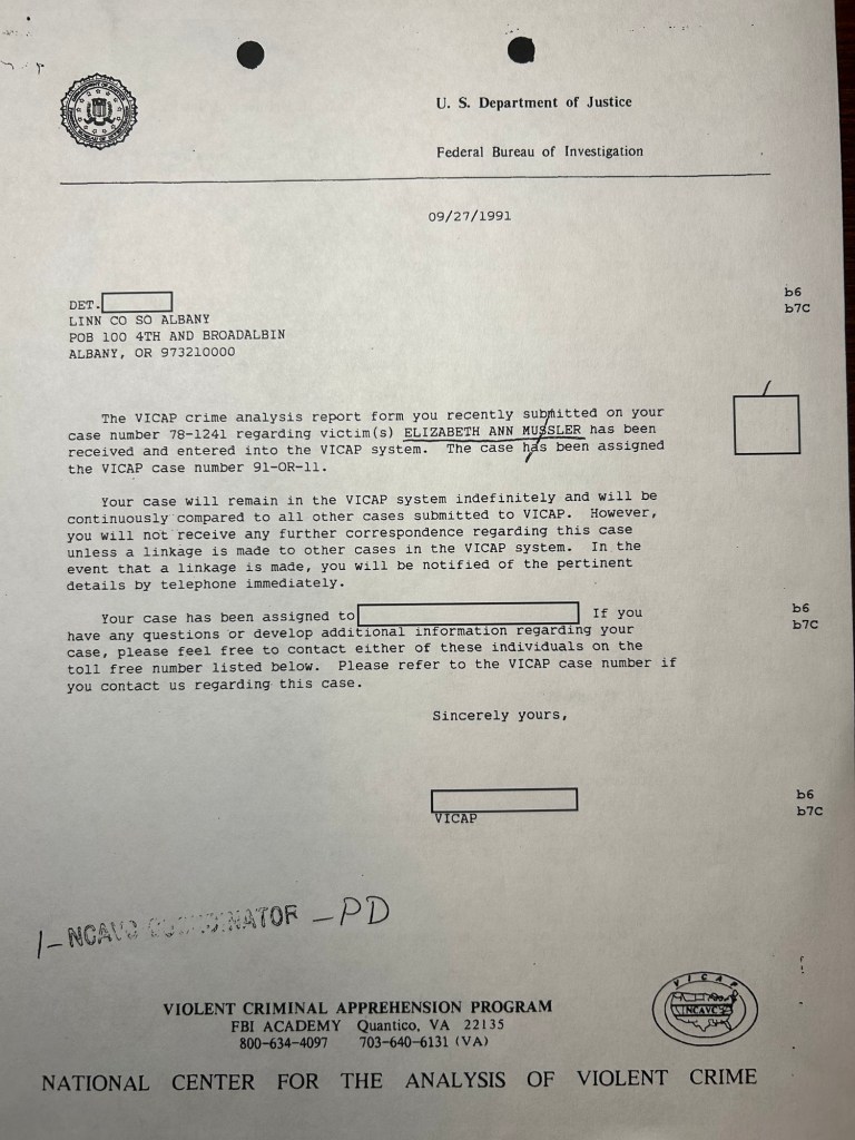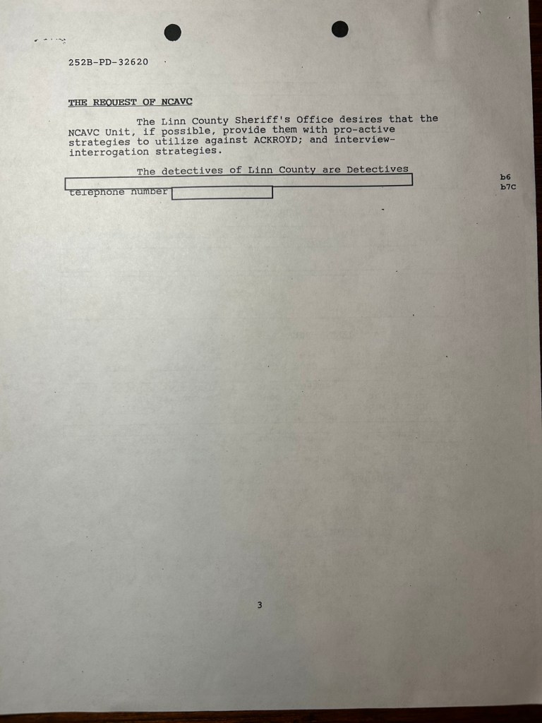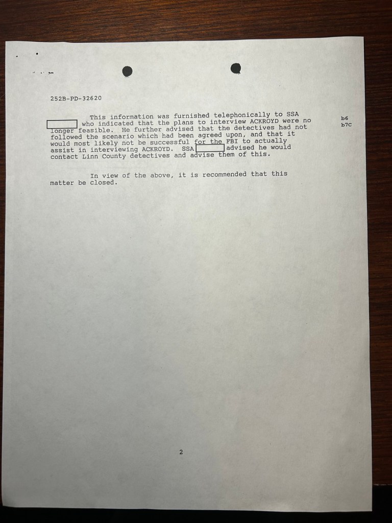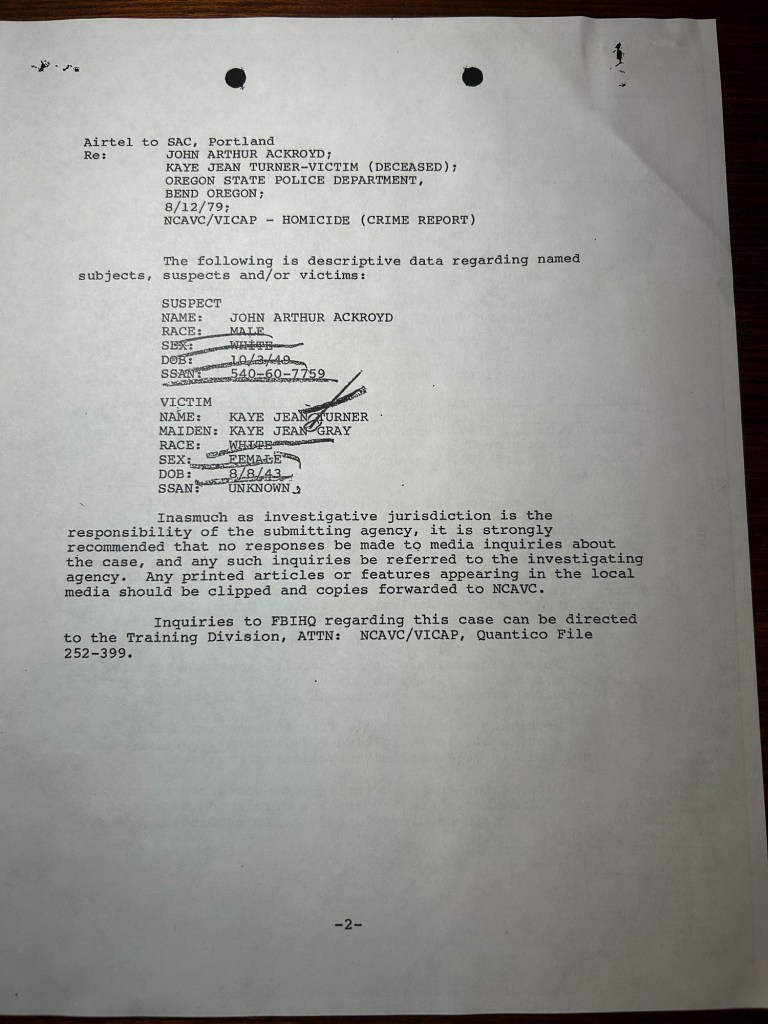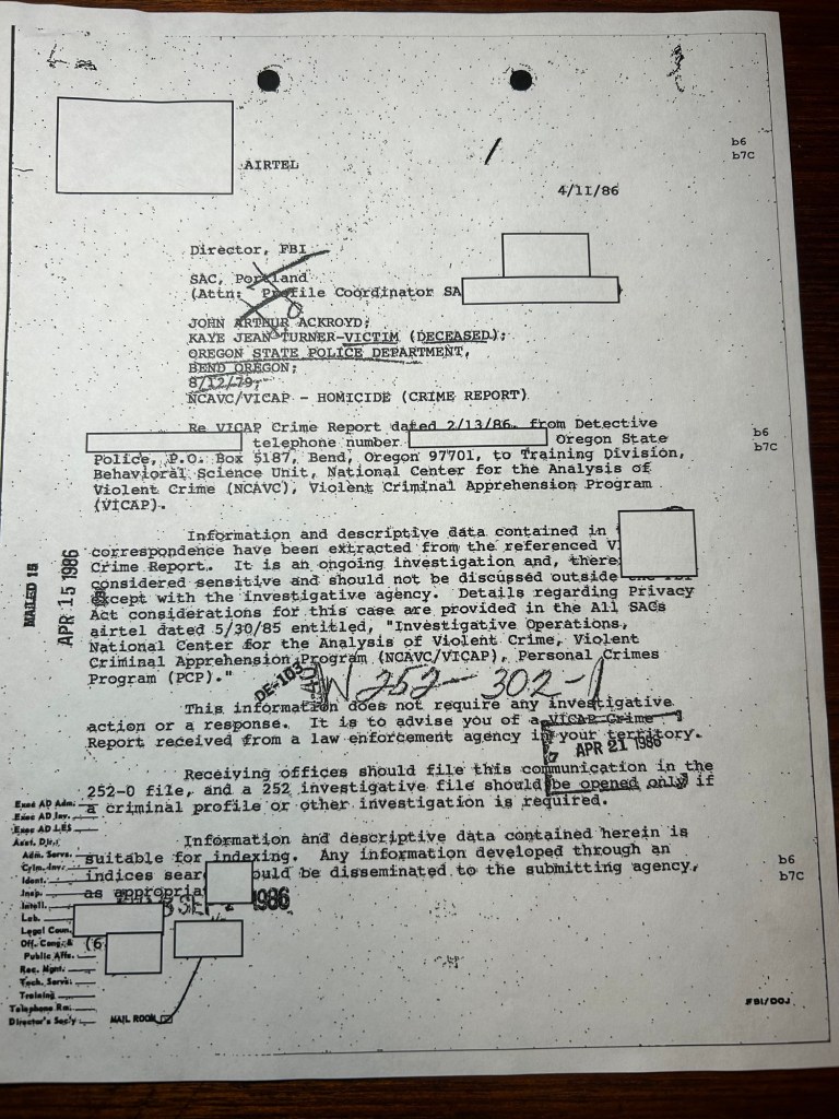 4/11/1986- OSP submits Kaye Jean Turner’s case to the Violent Criminal Apprehension Program (VICAP) run by the FBI’s Behavioral Analysis Unit. This is an airtel to the Portland FBI Field Office informing them that a VICAP report has been filed within their region.Further information in the 4/11/1986 airtel from Behavioral Analysis to Portland2/6/2012- A document from the reinvigoration era of the Ackroyd associated investigations as Ackroyd approached parole eligibility for his murder of Kaye Turner. This page documents a change in assignment for the FBI crime analyst assigned to Rachanda Pickle’s case.Airtel from SAC Portland to Behavioral Analysis regarding the Rachanda Pickle investigation, including information regarding Kaye Jean Turner and Elizabeth Ann Mussler. Dated 5/29/1991, this is approximately 11 months after Rachanda vanished from Santiam Junction. This is also the earliest document that associates Elizabeth Mussler’s 1977 homicide with John Ackroyd.Page 2 of the 5/29/1991 airtelPage 3 of the 5/29/1991 airtelAddendum to the 5/29/1991 airtel. Interesting to note that this document was produced after ODOT transferred Ackroyd from Santiam Junction to the Corvallis shops. Also of note is the 4th paragraph, which links Ackroyd to “three other homicides in the area, involving runaways.” Karen and Rodney are two of that number. Elizabeth Mussler, since she was an adult reported missing could be the third, as could the Swamp Mountain or Snow Creek Does. It is interesting to me that Ackroyd was linked to these late 70’s cases as early as 1991. Acknowledgement from the VICAP program to Linn County Sheriff’s Office that Elizabeth Ann Mussler’s case has been submitted to the VICAP system.Page 2 of the VICAP acknowledgement to LCSO re: MusslerCourtesy copy of the Mussler VICAP acknowledgement to the Portland FBI Office10/21/1991 A memo regarding VICAP profiling of the Rachanda Pickle, Kaye Jean Turner and Elizabeth Mussler cases. An interrogation approach has been developed to elicit a confession from Ackroyd.12/31/1991- Report from the Special Agent assigned to Ackroyd’s interrogation to the SAC in Portland. The conclusion of the Special Agent’s 12/31/1991 report, indicating that the interrogation approach was no longer feasible and that the FBI’s should close their part of the investigation.Oregonian Article, 6/14/1992 about the arrest of John Arthur Ackroyd and Roger Dale Beck in the murder of Kaye Jean Turner. Included in the FBI file