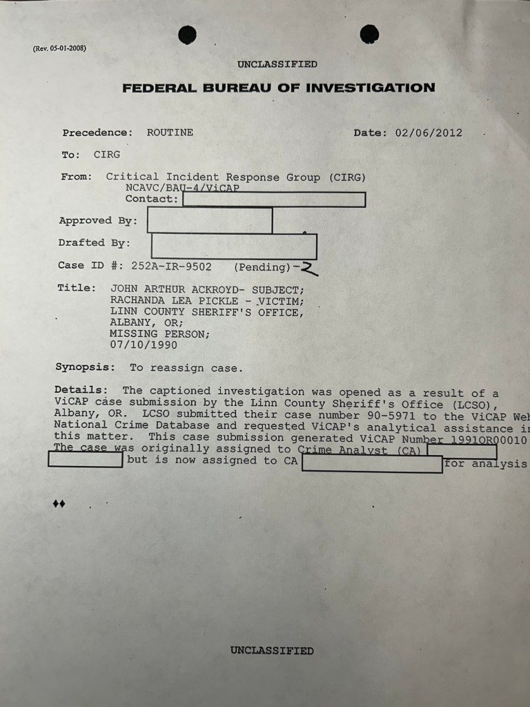 In the fall of 2023 I submitted a FOIA request to the FBI for a copy of any documents that the Bureau had on John Arthur Ackroyd. The crimes associated with him seemed to be handled at the local level, with assistance from the Oregon State Police, rather than with FBI assistance. I thought that the FBI might have been involved to some degree with Rachanda Pickle’s case, and that a FOIA request was worth the effort to see what was on hand. It took about 6 months or so for the documents to arrive on CD-ROM, about 13 pages in total. As I had thought, these cases were locally led without significant assistance from the FBI.