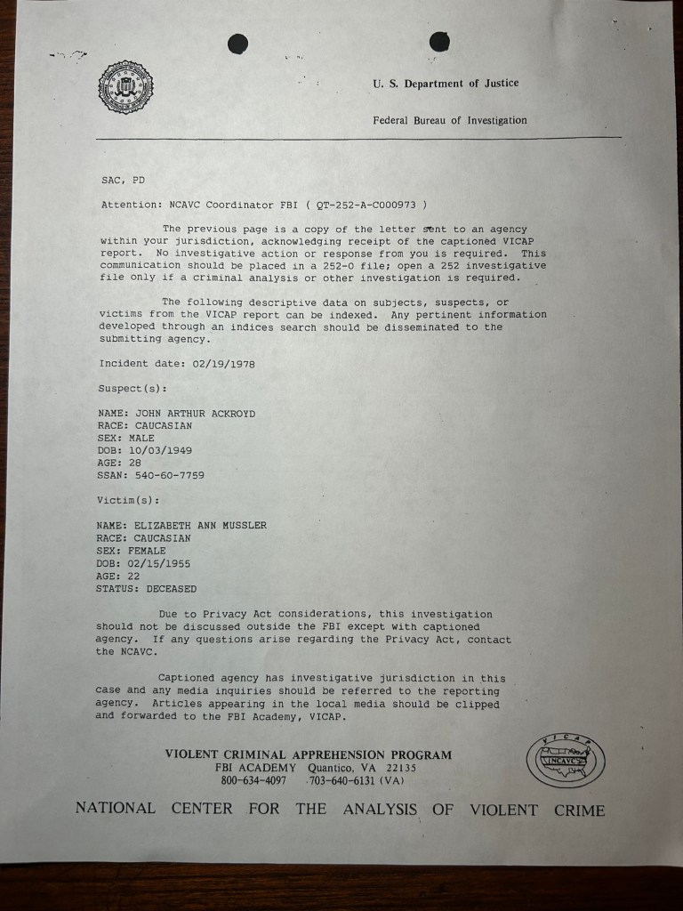 The interesting take aways from reading the file are 1) the Turner Case and Ackroyd were entered into VICAP in 1986; 2) John Ackroyd was a suspect in the homicides of Elizabeth Ann Mussler, Karen Jean Lee, Rodney Grissom and perhaps one additional case as early as 1991; 3) there was a missed opportunity for a BAU-informed interrogation of Ackroyd in the Turner / Mussler / Pickle cases.