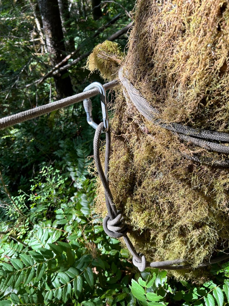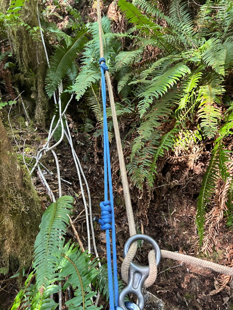 Last weekend I had marked off an area to search knowing I would need a rope system. Not knowing how this would work out, it was a fairly narrow strip down the hill. The box started out just slightly overlapping the 5 October search area, and extended to the north about 50m. I found a suitable anchor point, a well rooted and large Doug Fir, set up a friction hitch and began to rope up.