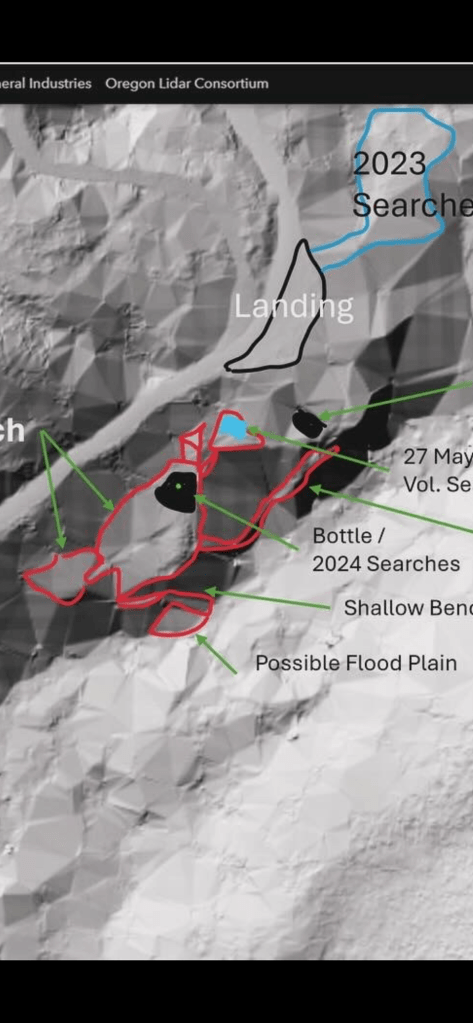The discovery of the slide area does concern me about any remains being found. Anything that was in that area slid into the creek and would have been taken down stream in the spring run-off. I’m not saying that definitely happened, but a large surface area of the hill is gone, along with anything that may have been there.