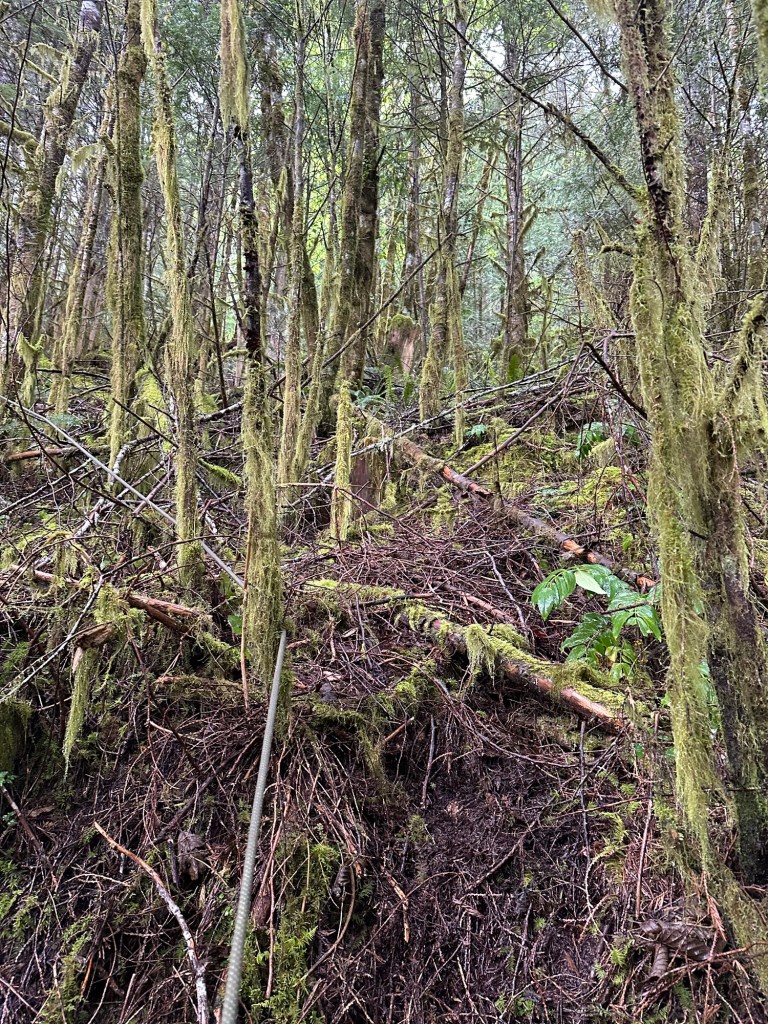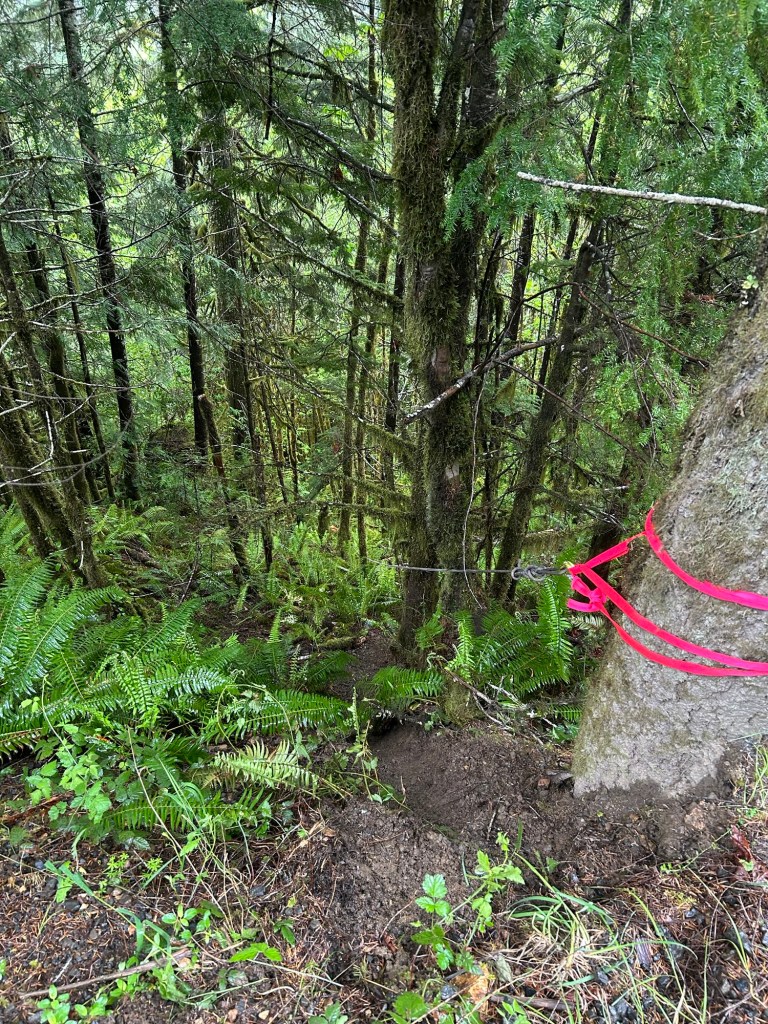 While the ground team took a breather, I checked in with the rope team, who were also on a break. They had dropped down the slope to the bench above the creek, and were clearing benches, debris traps and drainage chutes as they ascended to the road. After completing an ascent, they repositioned the rope, and repeated the descent and searching ascent.