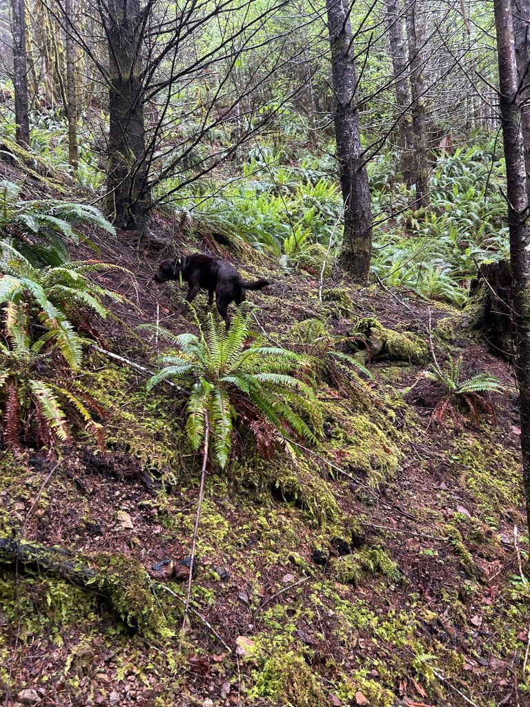 I had 7 friends show up on a very rainy and cool Saturday. The general plan was for the 3 with low angle experience to form a ropes team that will descend the slope below where Rodney’s clothes were found. Their task was to search that hillside for remains. The other 4 formed a ground search team, who would be called up if Trooper alerted or showed interest in an area.