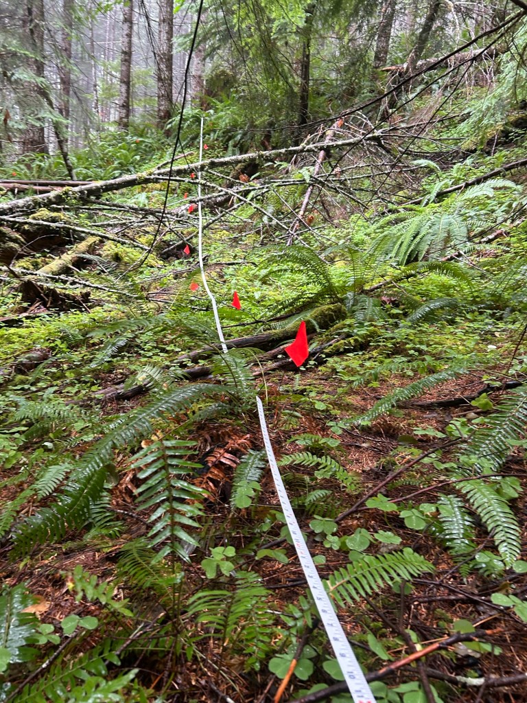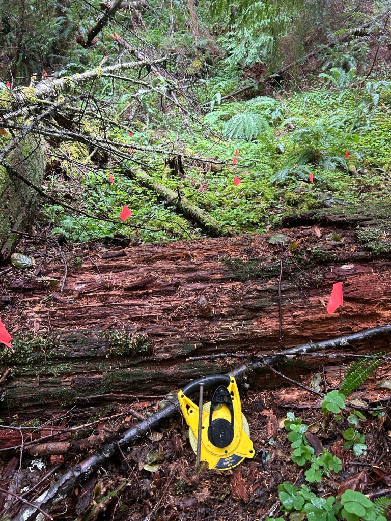 I arrived at the search site about 8am and rucked the supplies down the skidder track and then down the hill from the End of the Road to the spot Trooper identified. I drove a spike into the stump where he whined and stamped the ground. I looped the tape measure over the spike and walked due north for 50 feet. I placed a pin flag every five feet along the tape until I had the line marked. I wound the tape back onto the reel, and repeated this process in the four cardinal directions.